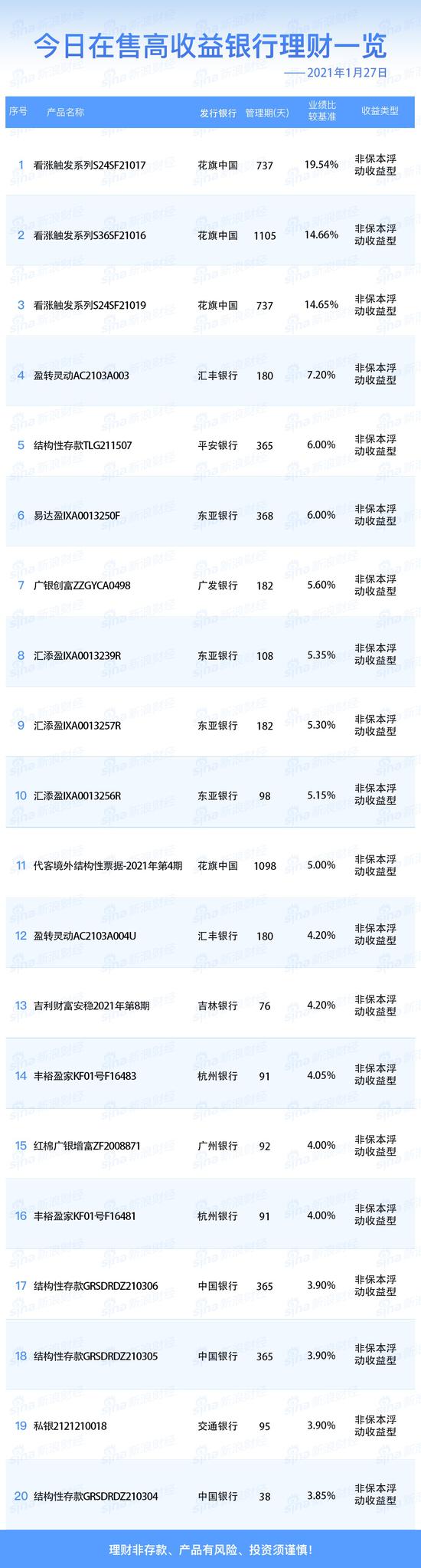 2月24日在售高收益银行理财产品:今日业绩比较基准在6%以上的银行人民币理财产品共6款。花旗中国“看涨触发系列S24SF21017”业绩比较基准最高,为19.54%。