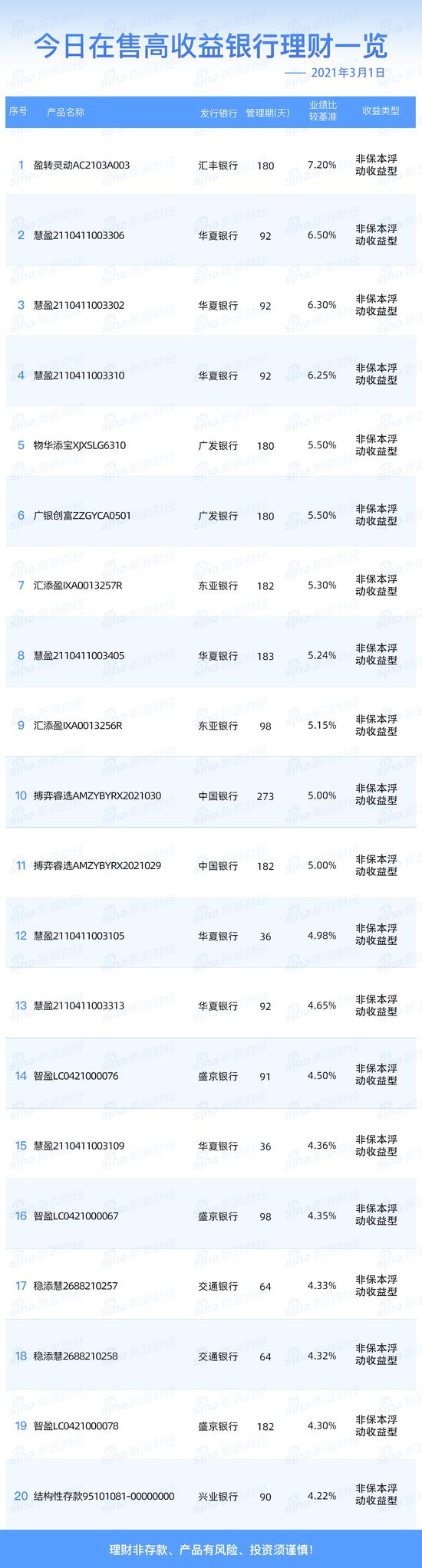 3月1日在售高收益银行理财产品:今日业绩比较基准在6%以上的银行人民币理财产品共4款。汇丰银行“盈转灵动AC2103A003”业绩比较基准最高,为7.2%。