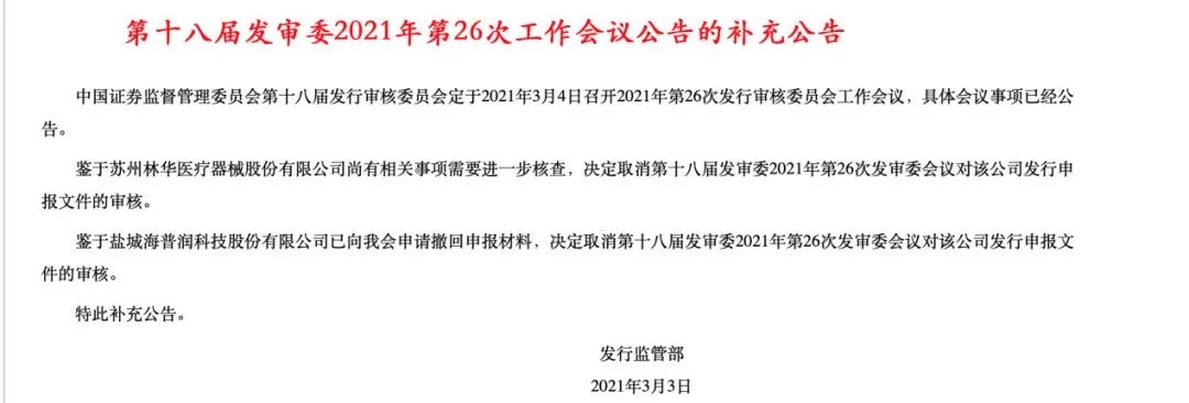 就在3月3日晚,证监会发行部公告称,鉴于林华医疗尚有相关事项需要进一步核查,以及鉴于海普润已申请撤回申报材料,决定取消对上述两家IPO企业的上会审核。