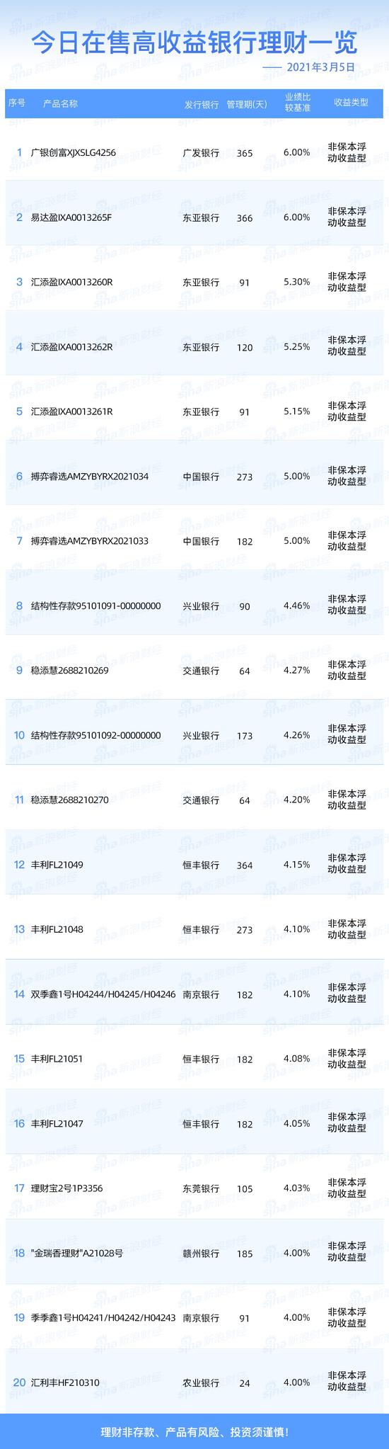 3月5日在售高收益银行理财产品:今日业绩比较基准在5%以上的银行人民币理财产品共7款。广发银行“广银创富XJXSLG4256”业绩比较基准最高,为6%。
