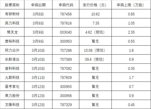 最新只有2只周一3月8日发行的2只新股披露发行价;不过按照预估价,3月10日发行的沪市主板新股长龄液压,可能有不小盈利机会。