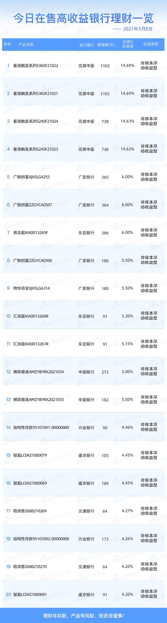 3月8日在售高收益银行理财产品