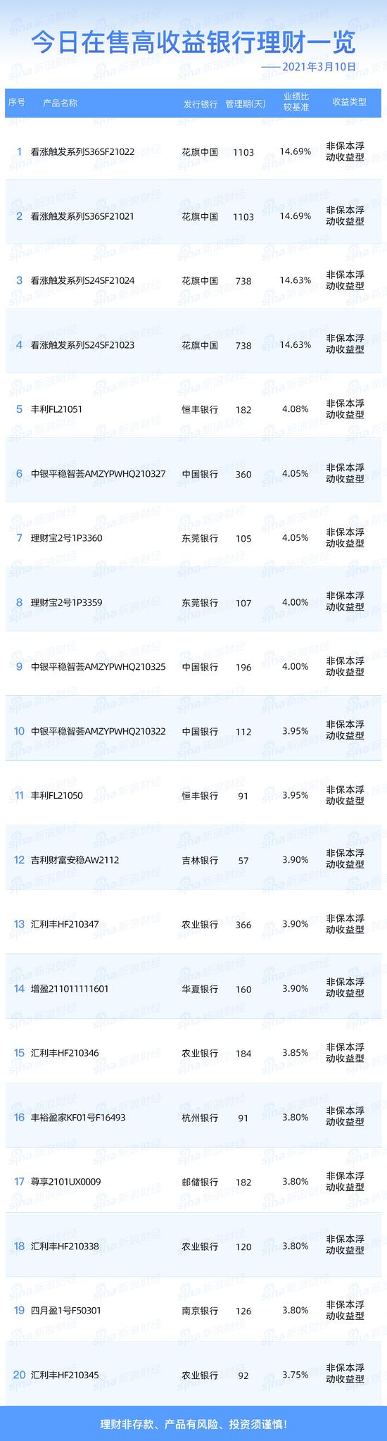 3月10日在售高收益银行理财产品