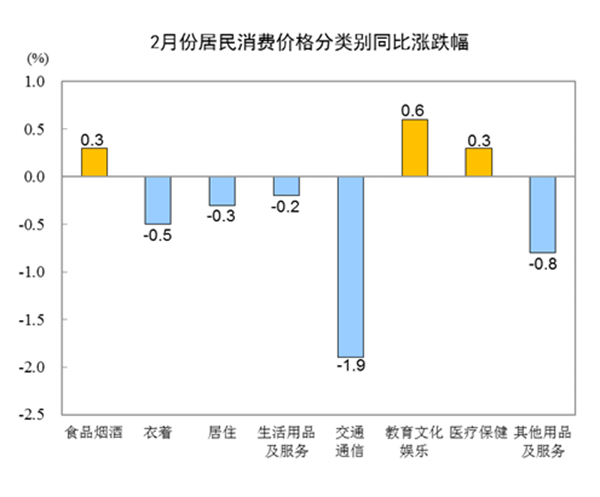 2月份,食品烟酒类价格同比上涨0.3%,影响CPI(居民消费价格指数)上涨约0.09个百分点。食品中,水产品价格上涨5.9%,影响CPI上涨约0.11个百分点;鲜菜价格上涨3.3%,影响CPI上涨约0.08个百分点;鲜果价格上涨3.1%,影响CPI上涨约0.06个百分点;蛋类价格上涨3.0%,影响CPI上涨约0.02个百分点;粮食价格上涨1.4%,影响CPI上涨约0.02个百分点;畜肉类价格下降7.3%,影响CPI下降约0.34个百分点,其中猪肉价格下降14.9%,影响CPI下降约0.39个百分点。