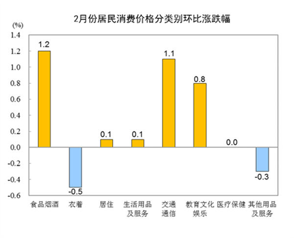 2月份,食品烟酒类价格环比上涨1.2%,影响CPI上涨约0.36个百分点。食品中,水产品价格上涨8.7%,影响CPI上涨约0.16个百分点;鲜果价格上涨6.1%,影响CPI上涨约0.12个百分点;鲜菜价格上涨1.8%,影响CPI上涨约0.05个百分点;蛋类价格下降3.8%,影响CPI下降约0.02个百分点;畜肉类价格下降1.0%,影响CPI下降约0.04个百分点,其中猪肉价格下降3.1%,影响CPI下降约0.07个百分点。