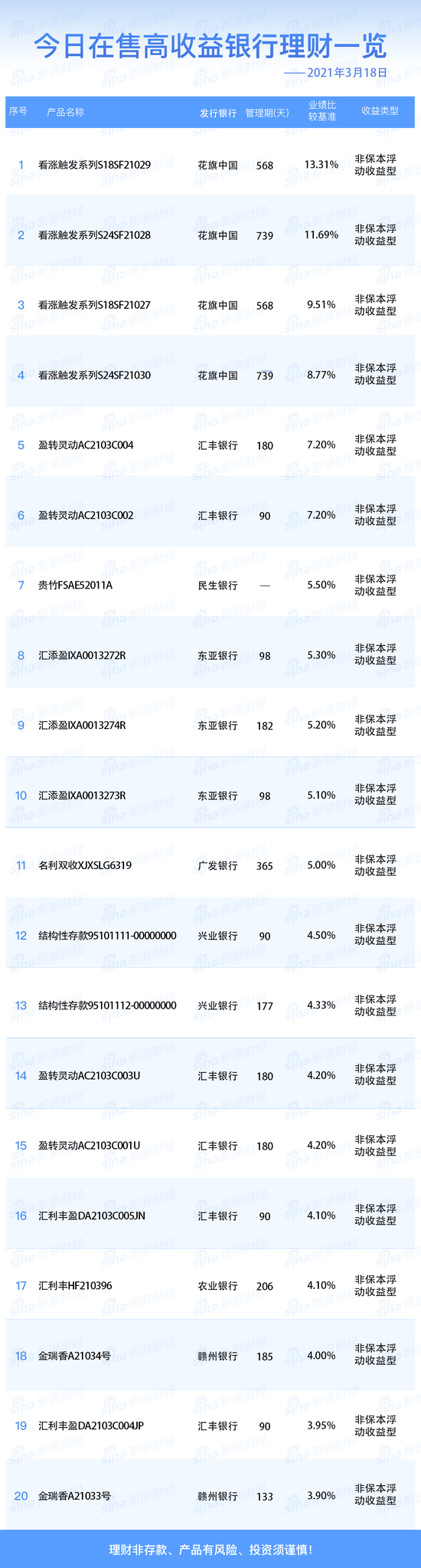 3月18日在售高收益银行理财产品:今日业绩比较基准在6%以上的银行人民币理财产品共6款。花旗中国“看涨触发系列S18SF21029”业绩比较基准最高,为13.31%。