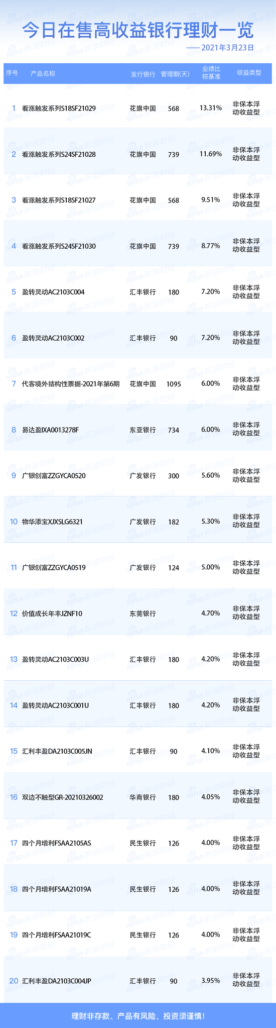 3月23日在售高收益银行理财产品:今日业绩比较基准在7%以上的银行人民币理财产品共6款。花旗中国“看涨触发系列S18SF21029”业绩比较基准最高,为13.31%。