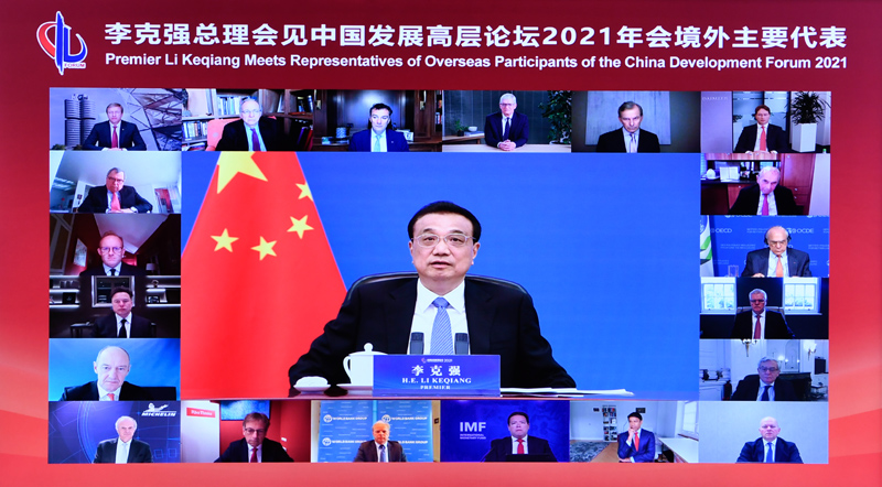 国务院总理李克强3月22日晚在人民大会堂以视频方式会见出席中国发展高层论坛2021年年会的境外代表。