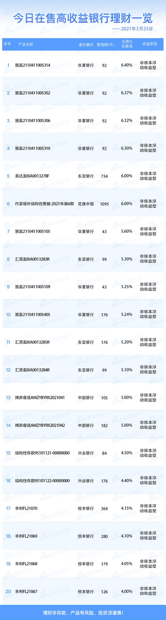 3月25日在售高收益银行理财产品:今日业绩比较基准在6%以上的银行人民币理财产品共6款。华夏银行(6.440, 0.01, 0.16%)“慧盈2110411005314”业绩比较基准最高,为6.40%。