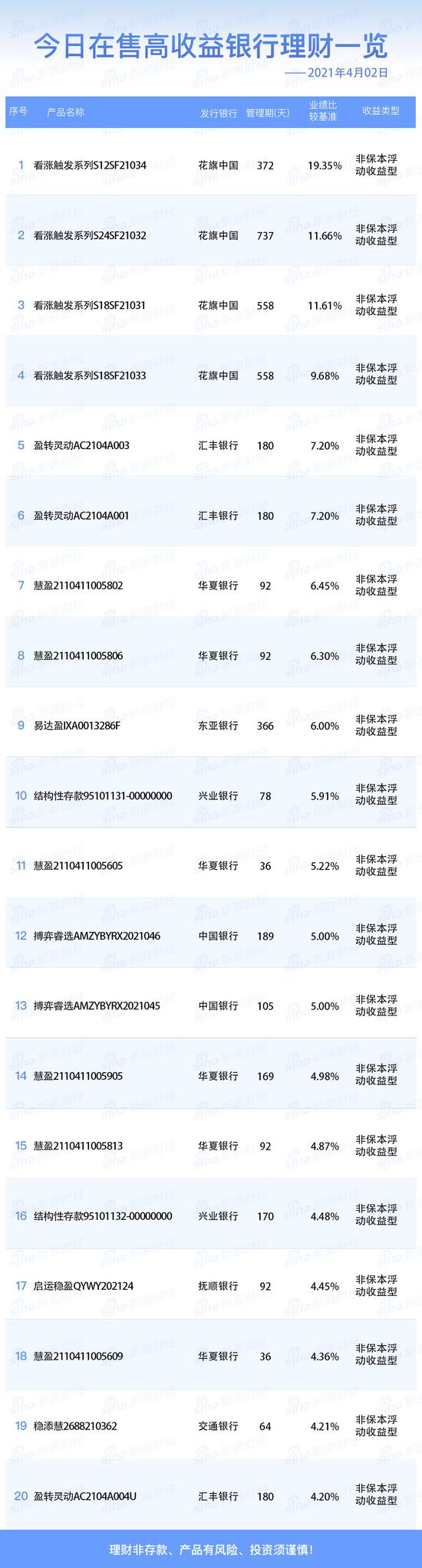 4月2日在售高收益银行理财产品:今日业绩比较基准在7%以上的银行人民币理财产品共6款。花旗中国“看涨触发系列S12SF21034”业绩比较基准最高,为19.35%。