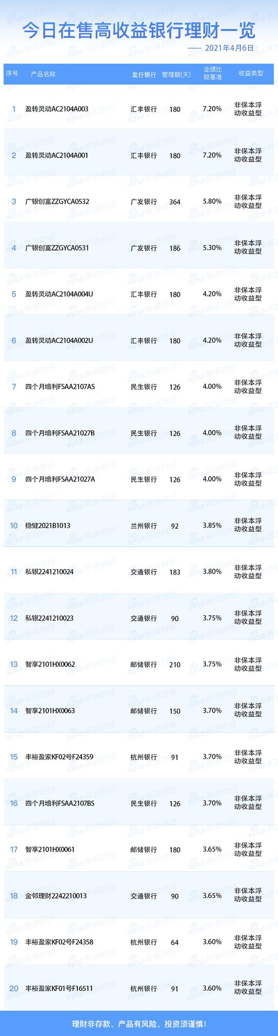 4月6日在售高收益银行理财产品:今日业绩比较基准在5%以上的银行人民币理财产品共4款。汇丰银行“盈转灵动AC2104A003”业绩比较基准最高,为7.20%。