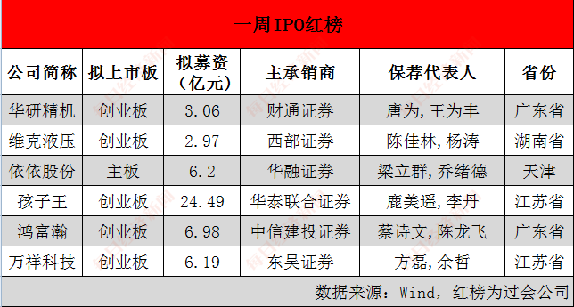 上周(4月5日~4月11日,下同),共有6家公司上会。其中,依依股份1家公司拟上主板,华研精机、维克液压、孩子王、鸿富瀚、万祥科技等5家公司拟上创业板,6家公司全部过会。