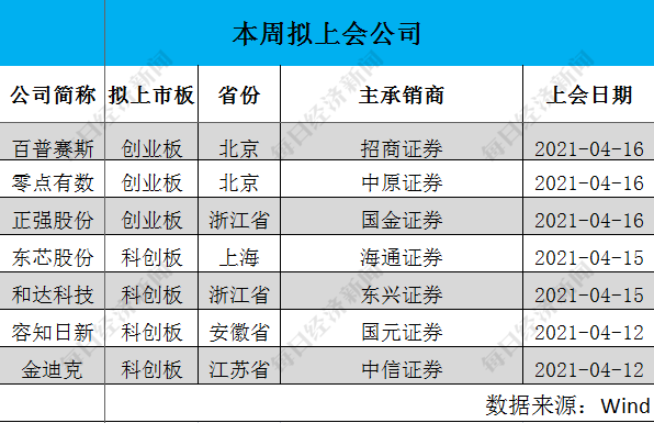 本周,将有7家公司迎来上会,相比前一周6家公司上会的数量,基本保持稳定。其中,拟登陆主板的公司数量为0;注册制下的创业板和科创板,有百普赛斯、零点有数、正强股份、东芯股份、和达科技、容知日新、金迪克等7家公司上会。