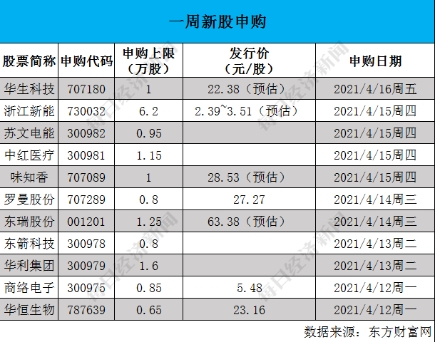 本周(4月12日~4月18日),A股有罗曼股份等11只个股将迎来申购。《每日经济新闻》记者注意到,东瑞股份的发行价高达63.38元/股,或能成为大肉签。而浙江新能预估发行价只有2.39~3.51元/股,即使中一签,也赚不来多少钱,只能算是蚊子肉。