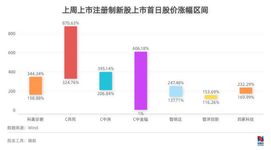 A股上周上市了11只新股,其中多数为注册制。从这些新股上市首日的股价表现看,中金辐照(300962,SZ)最佳,股价涨幅区间为606.18%~1076.47%。这家公司的发行价为3.4元/股,上市首日最高价为40元/股,最低价为24.01元/股。