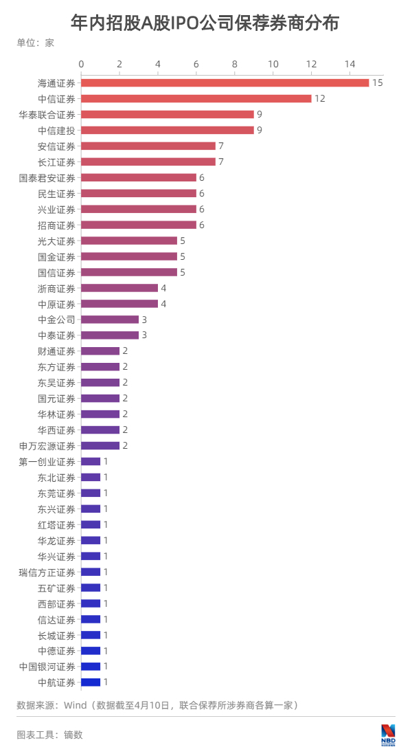 137家年内招股的A股公司中,海通证券独揽15家,雄踞榜首。紧随其后的是中信证券为12家;华泰联合证券和中信建投均为探花,都是9家。