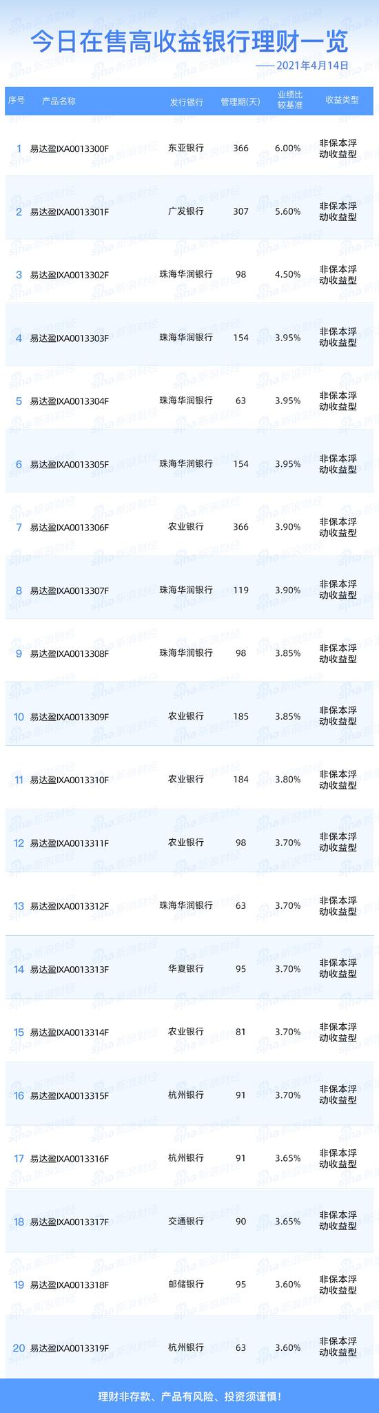4月14日在售高收益银行理财产品:今日业绩比较基准在4%以上的银行人民币理财产品共3款。东亚银行的“易达盈IXA0013300F”业绩比较基准最高,为6%。