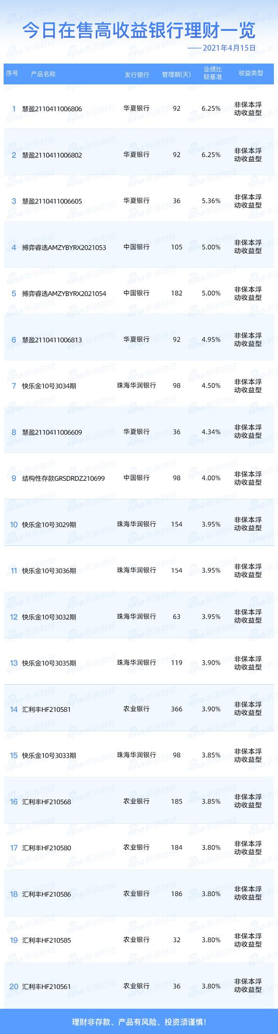 4月15日在售高收益银行理财产品