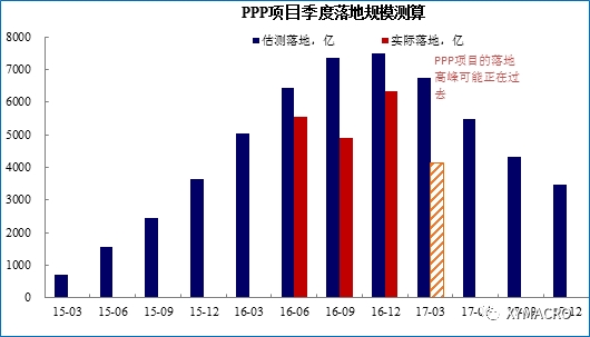 现在我们已经在2015年底2016年初看到了PPP项目发起的高峰;在2016年年中看到了PPP项目入库的高峰;而从测算来看2016年底2017年初将是PPP项目落地的高峰,2017年全年落地会呈现“前高后低”;虽然PPP项目投资具有较长的持续性,但增量最大的时候可能正在逐渐过去(详细测算请见后文).