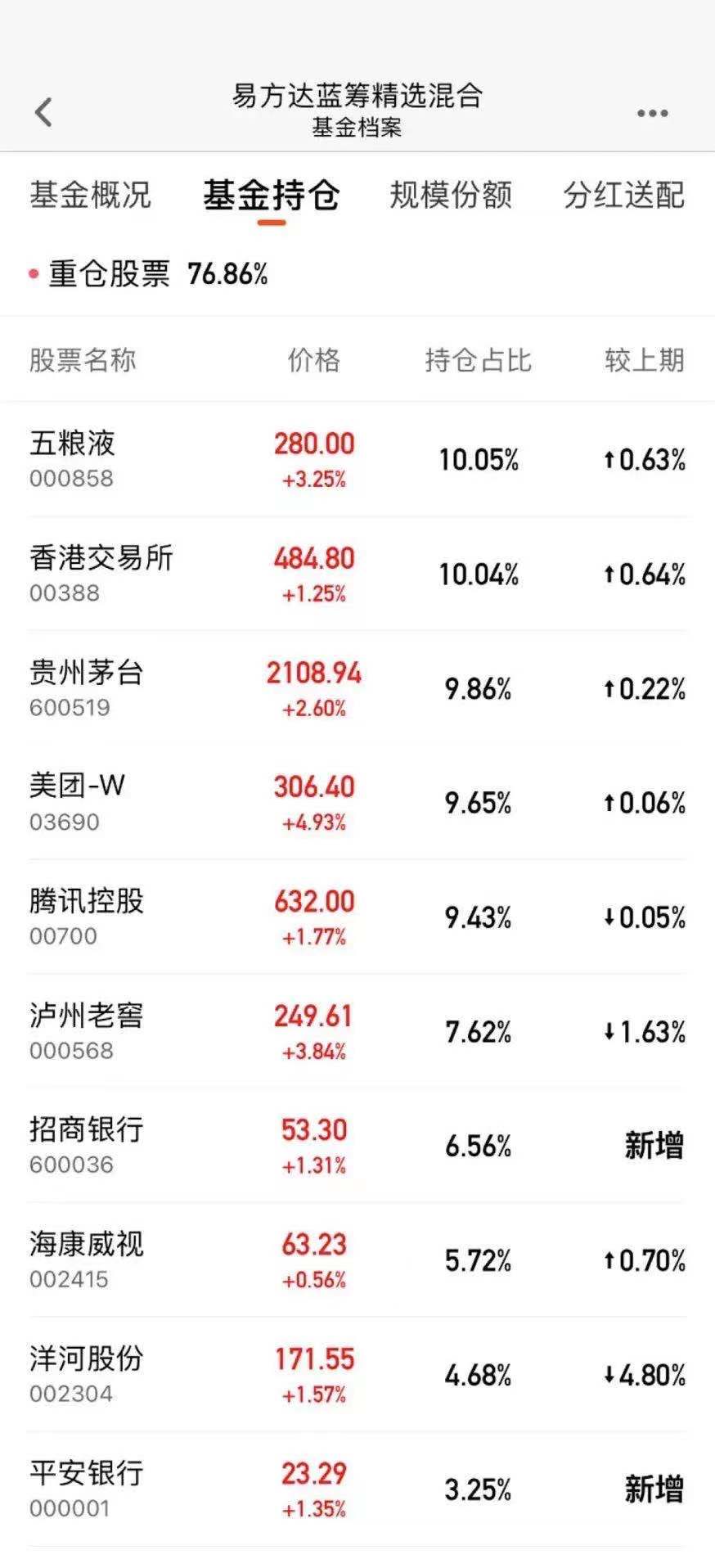 大家较为熟悉的基金产品中,“公募一哥”张坤所管理的易方达蓝筹精选的一季度十大重仓股中,新调入了招商银行和平安银行,持仓占比分别达到6.56%和3.25%。