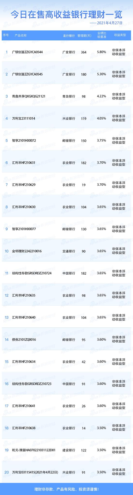 4月27日在售高收益银行理财产品:今日业绩比较基准在4%以上的银行人民币理财产品共4款。广发银行“广银创富ZZGYCA0544”业绩比较基准最高,为5.80%。