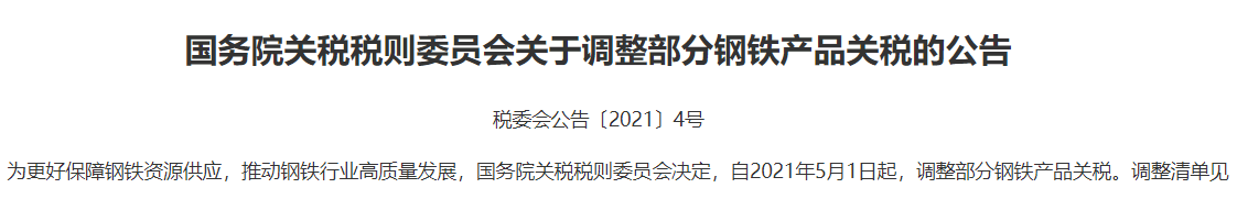 国务院关税税则委员会《关于调整部分钢铁产品关税的公告》称,为更好保障钢铁资源供应,推动钢铁行业高质量发展,经国务院批准,国务院关税税则委员会近日发布公告,自2021年5月1日起,调整部分钢铁产品关税。其中,对生铁、粗钢、再生钢铁原料、铬铁等产品实行零进口暂定税率;适当提高硅铁、铬铁、高纯生铁等产品的出口关税,调整后分别实行25%出口税率、20%出口暂定税率、15%出口暂定税率。