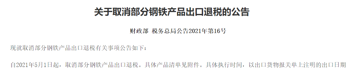 财政部、税务总局发布《关于取消部分钢铁产品出口退税的公告》称,自2021年5月1日起,取消部分钢铁产品出口退税。具体执行时间,以出口货物报关单上注明的出口日期界定。