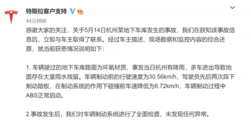 特斯拉客户支持微博发文称,关于5月14日杭州某地下车库发生的事故,就当前获悉情况说明如下:1。 车辆驶过的地下车库路面为环氧材质,事发当日杭州有降雨,多车进出导致地面存在大量雨水残留。车辆制动前的行驶速度为30.56km/h,驾驶员先后两次踩下制动踏板,在制动系统的作用下碰撞前车速降低为6.72km/h,车辆制动过程中ABS正常启动。2。事故发生后,我们对车辆制动系统进行了全面检查,未发现任何异常。
