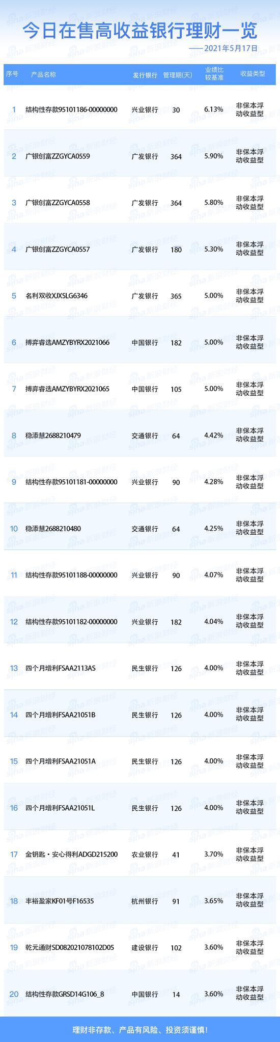 5月17日在售高收益银行理财产品