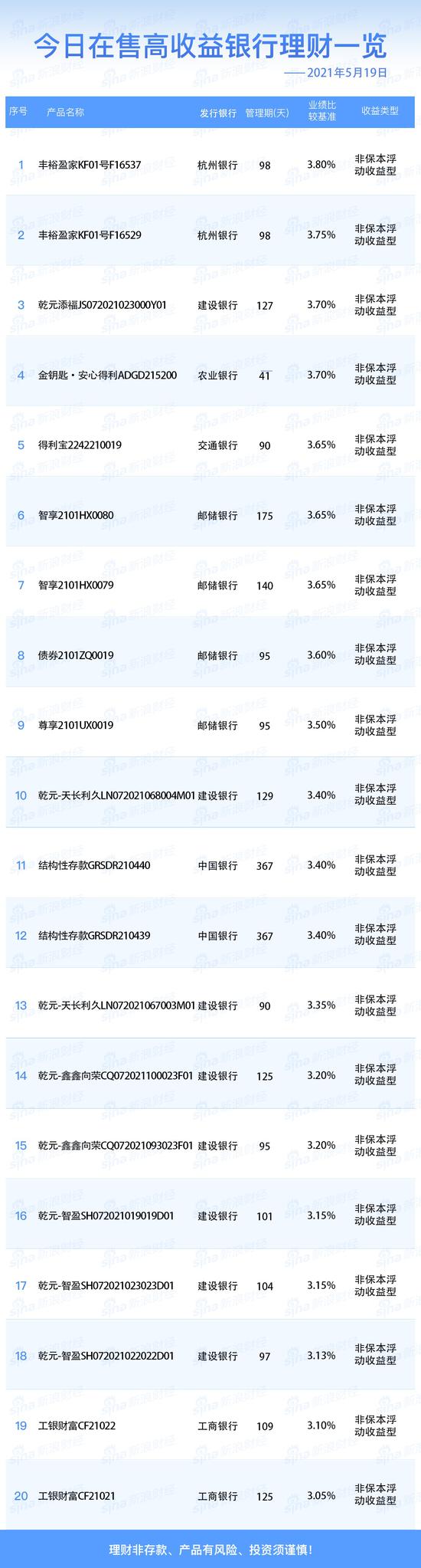 5月19日在售高收益银行理财产品:今日业绩比较基准在3.7%以上的银行人民币理财产品共4款。杭州银行(16.370, -0.10, -0.61%)“丰裕盈家KF01号F16537”业绩比较基准最高,为3.80%。