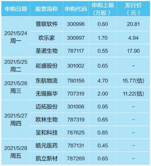 据目前安排,若无变化,本周(5月24日至28日)共有11只新股可申购,包括沪市主板2只、科创板5只、创业板4只。