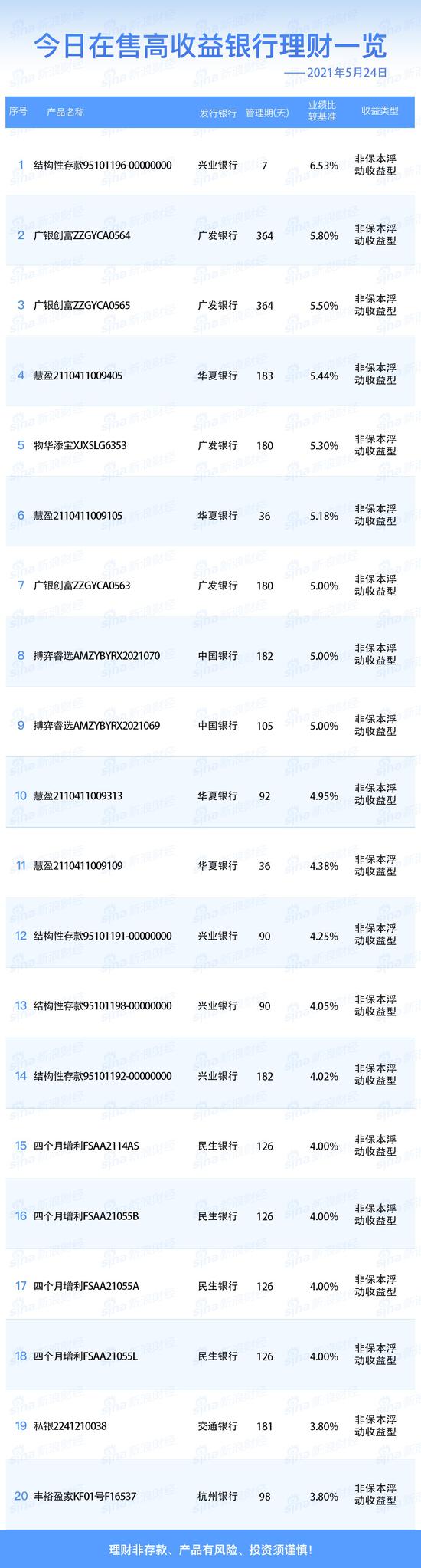 5月24日在售高收益银行理财产品:今日业绩比较基准在5%以上的银行人民币理财产品共9款。兴业银行(21.760, 0.35, 1.63%)“结构性存款95101196-00000000”业绩比较基准最高,为6.53%。