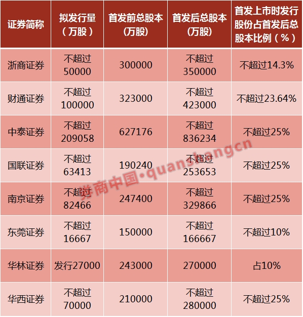 拟发行股份最多的是中泰证券,不超过20.9亿股;其次是财通证券拟发行10亿股,南京证券拟发行8.25亿股,华西证券拟发行7亿股,国联证券拟发行6.34亿股。这些券商发行股份都不超过首发后总股本的25%。