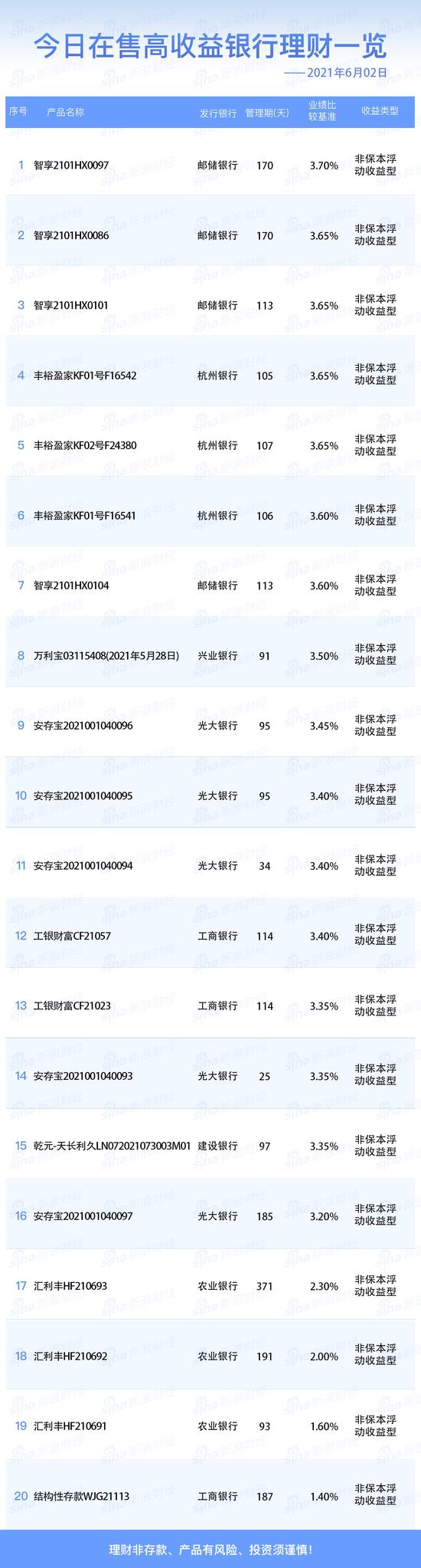 6月2日在售高收益银行理财产品:今日业绩比较基准在3.5%以上的银行人民币理财产品共8款。邮储银行(5.500, -0.04, -0.72%)的“智享2101HX0097”业绩比较基准最高,为3.7%。