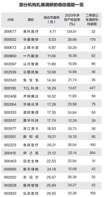 从投资回报来看,估值低于20倍的英科医疗、华峰化学以及估值接近30倍的汤臣倍健今年一季度净资产收益率超过10%、2020年净资产收益率均超过20%。从机构调研情况来看,6只个股调研机构超百家,其中TCL科技调研机构超过400家,伊之密、拓邦股份调研机构超200家。