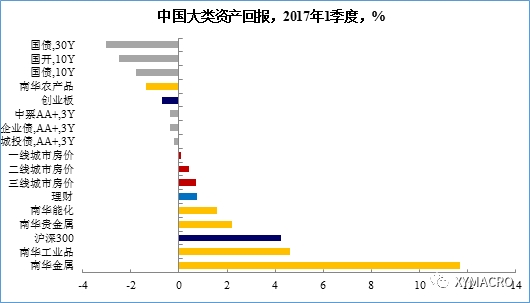经济“小阳春”+流动性“易紧难松”下,2017年1季度资产表现:工业商品>大盘股>黄金>现金>小盘股>信用债>利率债。在上一期大类资产配置手册提到在流动性趋紧但基本面改善的类复苏初期格局下,资产配置的逻辑需要沿着“盈利向上,估值向下”的这一主线。而由于此轮经济改善的主线在于供给侧改革带来的供需结构性的调整,因此,中上游的价格反弹的力度更突出,且大盘股优于小盘股,而流动性最敏感的利率债则出现显著调整。