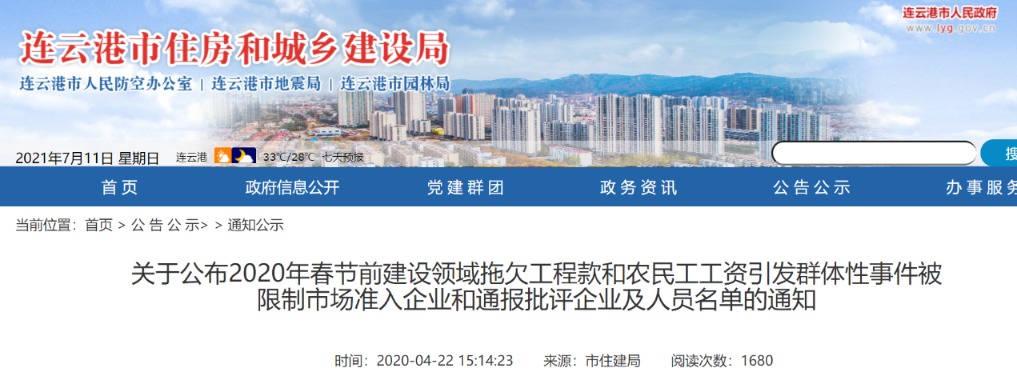 根据连云港市住房和城乡建设局在2020年4月22日发布的《关于公布2020年春节前建设领域拖欠工程款和农民工工资引发群体性事件被限制市场准入企业和通报批评企业及人员名单的通知》,其中公布的通报批评企业名单中,就包括了上海港湾,具体描述为:(事发地:徐圩新区烷烃资源综合利用产业项目及罐区真空预压软基处理工程)由上海港湾基础建设(集团)股份有限公司承建的徐圩新区烷烃资源综合利用产业项目及罐区真空预压软基处理工程,该施工单位管理不善,以工程款不到位为由不支付劳务工资;未严格落实实名制管理要求,2019年7月拖欠40余名农民工工资260万元,企业解决不力,造成班组长孙念带领部分民工及桩基承包人到属地政府部门上访,涉及金额和人数较大,影响较为恶劣。