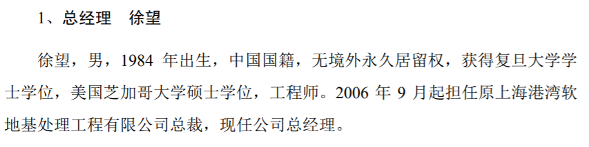 此外,招股书披露徐望先生生于1984年,获得复旦大学学士学位和美国芝加哥大学硕士学位,2006年9月起担任原上海港湾软地基处理工程有限公司总裁。从年龄推算,徐望先生本科学历毕业并获得学士学位就应当是在2006年,也即毕业后即担任了上海港湾软地基处理工程有限公司总裁。