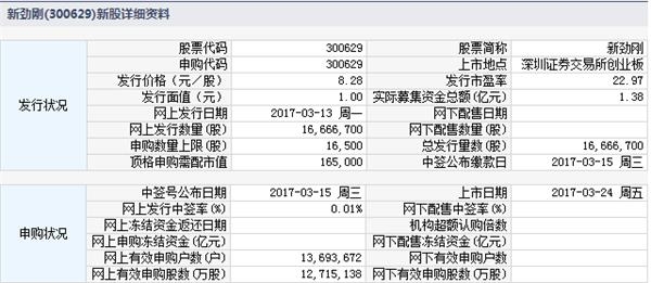 中国证券网讯根据交易所公告,广东新劲刚新材料科技股份有限公司于2017年3月24日起在深交所创业板上市。
