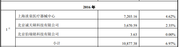 国科恒泰曾于2018年5月发布过招股书(申报稿)并申请上市,但随后被否决,在当日发布的招股书披露信息中,“上海淡泉医疗器械中心”、“ 北京诚天硕科技有限公司”、“ 北京伯瑞铭科技有限公司”作为同一控制下的经营主体合并计算成为国科恒泰2016年度第一大客户,合计销售金额上亿元。