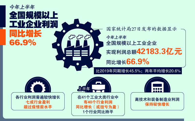上半年,随着我国经济稳中加固、稳中向好,工业生产需求稳定恢复,企业经营状况持续改善,企业利润实现平稳较快增长。国家统计局公布的最新数据显示,1至6月份,全国规模以上工业企业实现利润总额42183.3亿元,同比增长66.9%,比2019年同期增长45.5%,两年平均增长20.6%。其中,二季度规模以上工业企业利润同比增长36.0%,比2019年同期增长42.5%,两年平均增长19.4%。