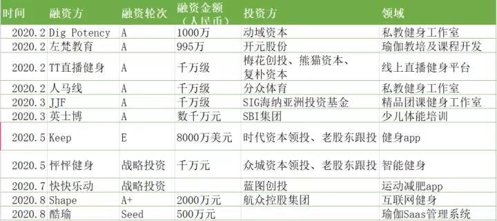 从投资领域看,2020年的投资主要涉及健康食品、在线健身平台、智能健身、运动鞋服、健身器材、少儿培训和运动康复等。健康食品、在线健身平台、智能健身最受资本青睐,在线健身平台共获得7笔投资。