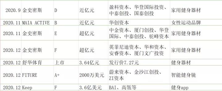 受惠于此,健身市场投融资活跃度在2020年也有明显提升,近半企业融资规模在千万元左右,有9笔融资规模过亿元。其中,从事健身器材生产的舒华体育(605299)于2020年12月在上交所上市,募集资金3.64亿元。