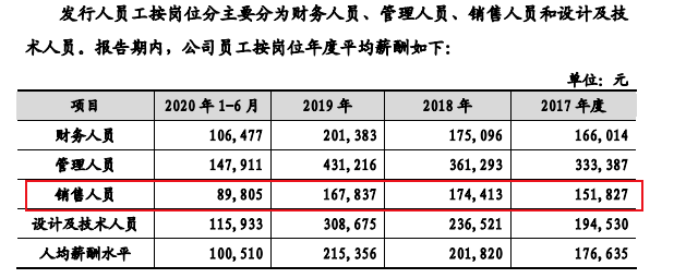 与此同时,菜百股份薪酬分配中还出现了利润增长,但销售人员工资不增反降的情况。招股书显示,2019年,菜百股份净利润4.02亿元,比上一年增长8.4%。公司财务、管理人员、设计及技术人员工资均出现不同程度的增幅,设计与技术人员工资增长超过30%,但销售人员工资却出现明显下降,由2018年平均17.4万元下降至16.7万元。