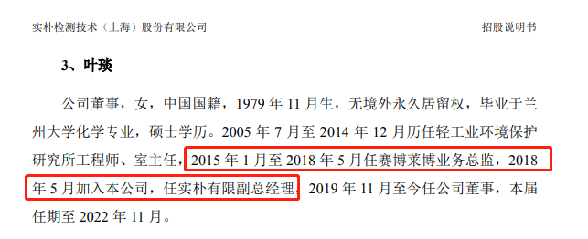 招股说明书显示,叶琰是实朴检测董事会秘书,招股书介绍,叶琰2015年1月至2018年5月任赛博莱博业务总监,2018年5月加入实朴检测,任实朴有限副总经理,2019年11月至今任公司董事。