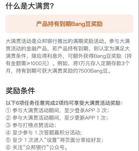 以众邦银行App大满贯活动为例,储户每存入1万元三个月期限的定期存款,持有到期即可获得7500个Bang豆,等价于人民币75元。根据该行App页面,三个月定期存款年化利率为1.6%,如果加上Bang豆价值,持有到期的年化收益率可以达到4.6%。
