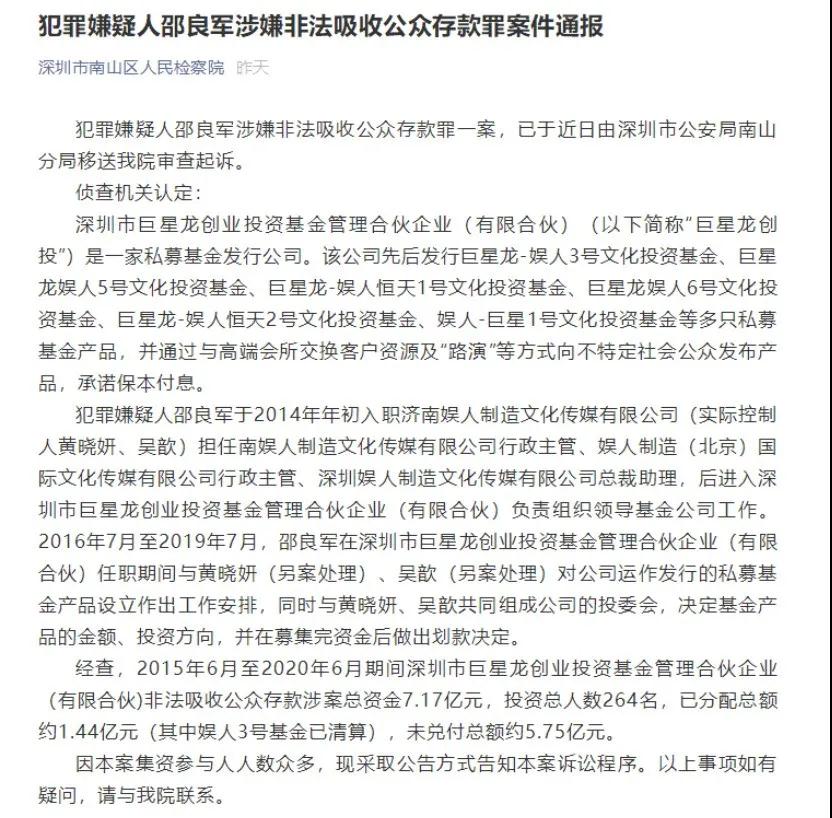 据深圳市南山区人民检察院消息,犯罪嫌疑人邵良军涉嫌非法吸收公众存款罪一案,已于近日由深圳市公安局南山分局移送该院审查起诉。经查,深圳市巨星龙创业投资基金管理合伙企业(有限合伙)非法吸收公众存款涉案总资金7.17亿元,投资总人数264名,未兑付总额约5.75亿元。