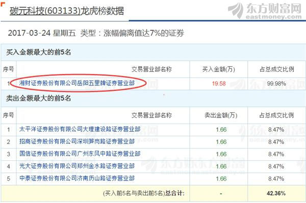 碳源科技在上市后的第5个涨停板:当日成交额为19.58万元,有湘财证券岳阳五里牌营业部全部“收下”。