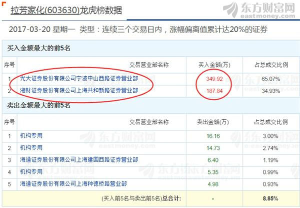 拉芳家化在上市后的第6个涨停:光大证券宁波中山西路营部抢入349.92万元的拉芳家化,湘财证券上海共和新路营业部抢入187.84万元的拉芳家化。让人羡慕的是,在这两家营业部抢入之后,拉芳家化又收到了4个一字板!
