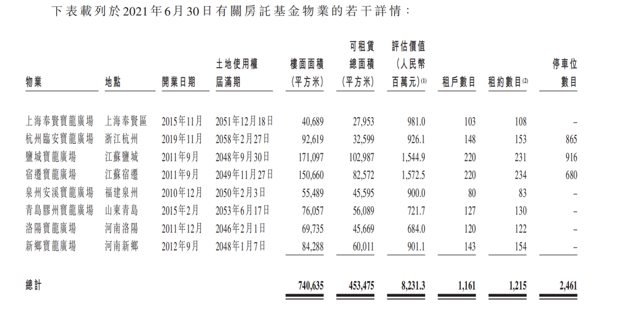 这八项房托基金物业均全为位于华东及华中的购物中心,具体包括上海奉贤宝龙广场、杭州临安宝龙广场、盐城宝龙广场、宿迁宝龙广场、泉州安溪宝龙广场、青岛胶州宝龙广场、洛阳宝龙广场及新乡宝龙广场。